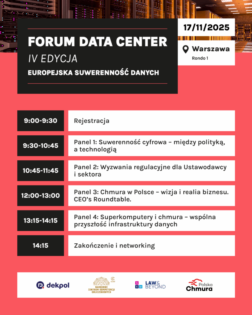 IV edycja Forum Data Center odbyła się 17 listopada 2025 r. pod hasłem „Europejska suwerenność danych”. Konferencja zgromadziła ponad 100 przedstawicieli biznesu, administracji i nauki. W ramach 4 paneli dyskutowano najważniejsze wyzwania stojące przed operatorami usług chmurowych, ale też ustawodawcą i administracją publiczną.
